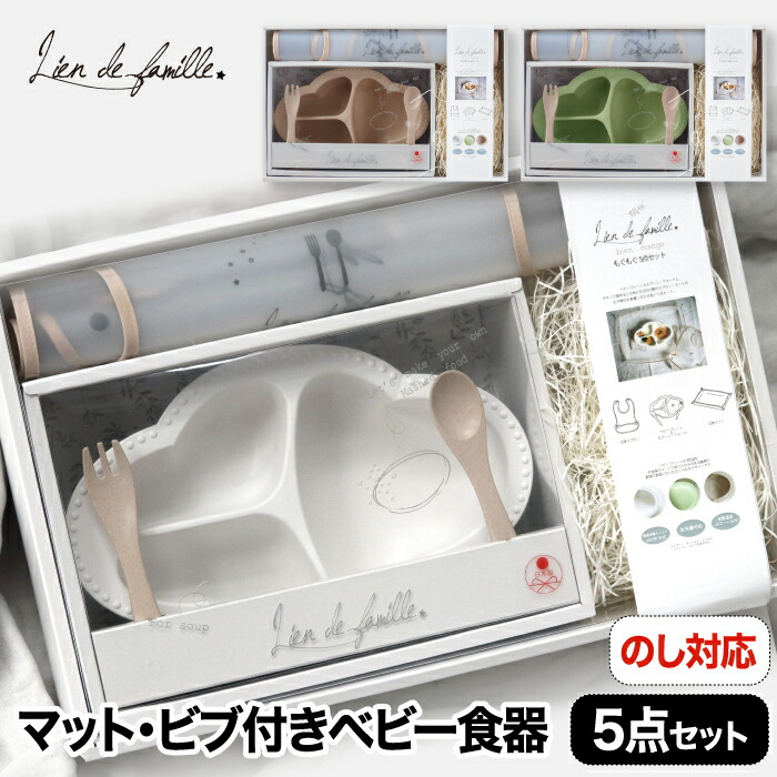 ●bien mangeシリーズの5点セットギフトです。●EVA素材のお食事エプロンとマットのセット+大人気の竹粉原料のバイオマスプラスチック製の食器プレートとカトラリーが一つになりました。●おしゃれなデザインでお食事も楽しく。【食器とカトラリー詳細】・家庭用電子レンジ600W対応・食洗機対応・耐熱温度ー40℃〜+140℃・抗菌効果99% 防カビ試験もクリア!・食材をすりつぶしながら食べさせることができる星型の突起付き。・スープなどの水分量の多いお料理もいれられる深さ(約3cm)のあるワンプレートで、お皿洗いの手間も減らせます。※抗菌効果は全ての菌やウイルスに効果があるものではありません。予めご了承ください。【エプロンとマット詳細】合成樹脂「EVA」製のベビーエプロン&マット。水に強く軽量、柔らかく弾力もあるので、スナップで簡単に立体に形作ることができ、水分や食べこぼしをしっかりキャッチ。水洗いでサッと汚れを落とすことができます。離乳食初期から幼児期まで長くご利用可能です。