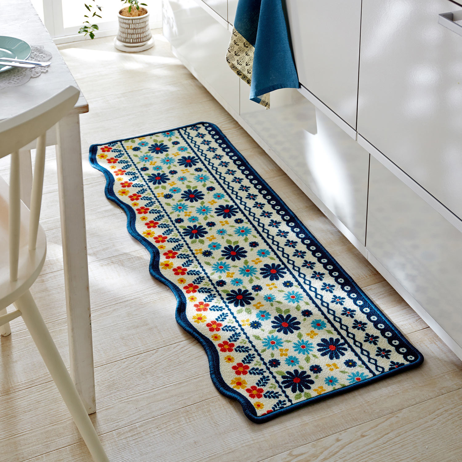 かわいらしい花柄をプリントした、色鮮やかなキッチンマット裾部分のスカラップデザインがポイントです程よい厚みで掃除しやすく、撥水加工付き汚れたら気軽に洗濯機でお洗濯OK裏面はすべりにくい加工付きです