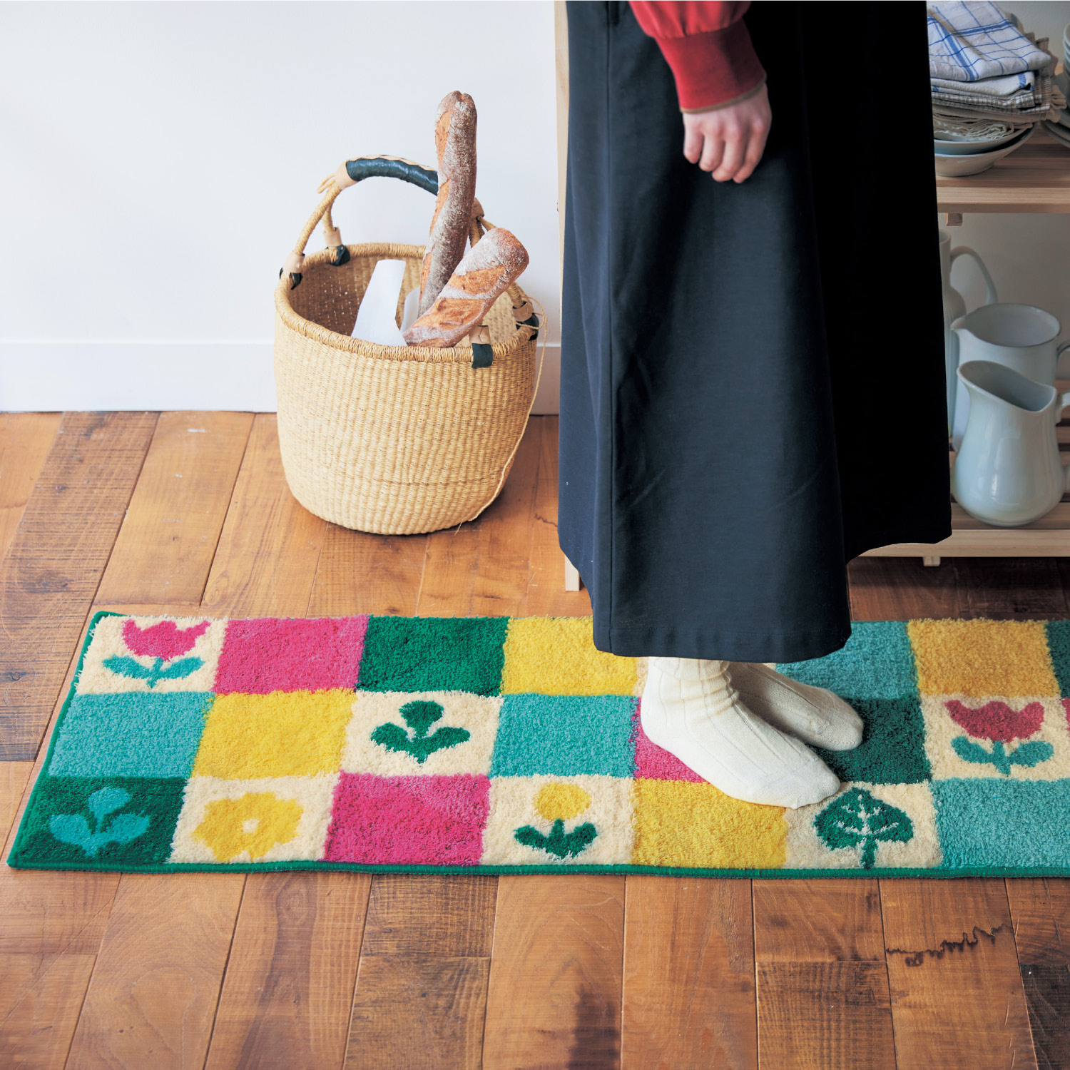 ループパイルでしっかりとしながらも柔らかな踏み心地家事をしている間も快適です汚れたら、小さくたためて簡単に洗濯できるのも◎洗濯機で洗うときに、かさばるお悩みを解消しますミックスカラーの風合いが、どんなキッチンにもぴったり合います