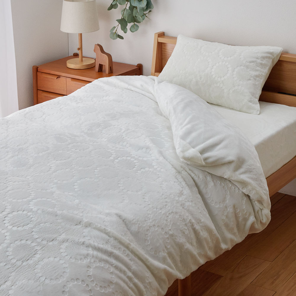 なめらかな肌ざわりのマイクロファイバー素材を使用無地のように使いやすい、さりげない北欧調サークルデザインがポイントデザインはエンボス加工で立体的に表現秋口や春先は布団を入れずにカバーだけで毛布のようにもお使いいただけます枕カバー、掛け布団カバー、シーツのお得な3点セット3点セットだから洗い替えや買い替えにはもちろん、来客用にもおすすめ布団との摩擦による生地の傷みをやわらげる裏地付き