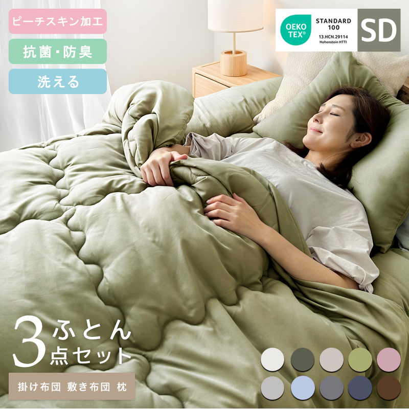 側生地:ポリエステル100%(ピーチスキン) 中綿:ポリエステル100%(中空ポリエステル混) サイズ 掛布団:170×210cm 敷布団:120×210cm 枕:43×63cm 梱包サイズ:(約)38×58×34cm 企画:日本 中国製 掛け布団 敷き布団 枕 布団3点セット さらさら生地 お買い得 来客 新生活 引っ越し セミダブル布団 シンプル