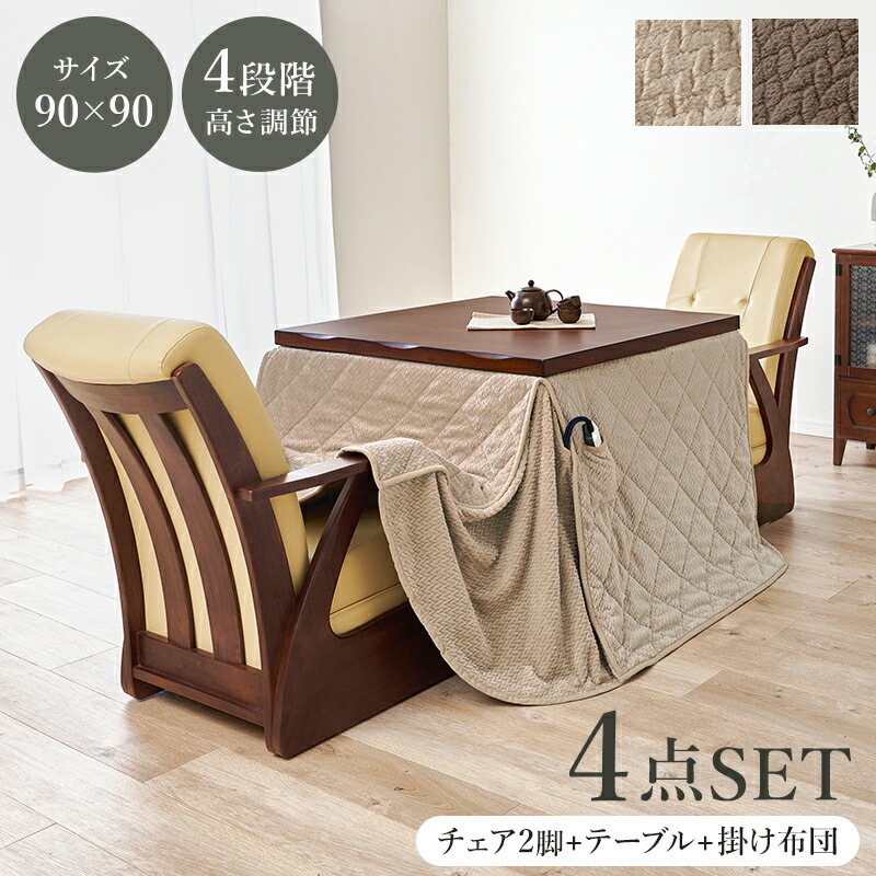 ■こたつセット ダイニングコタツ 4点セット 山城90ポカ4S ダイニングこたつ+こたつチェア 2脚+布団セット 家具調こたつ 2人掛け 90x90cm