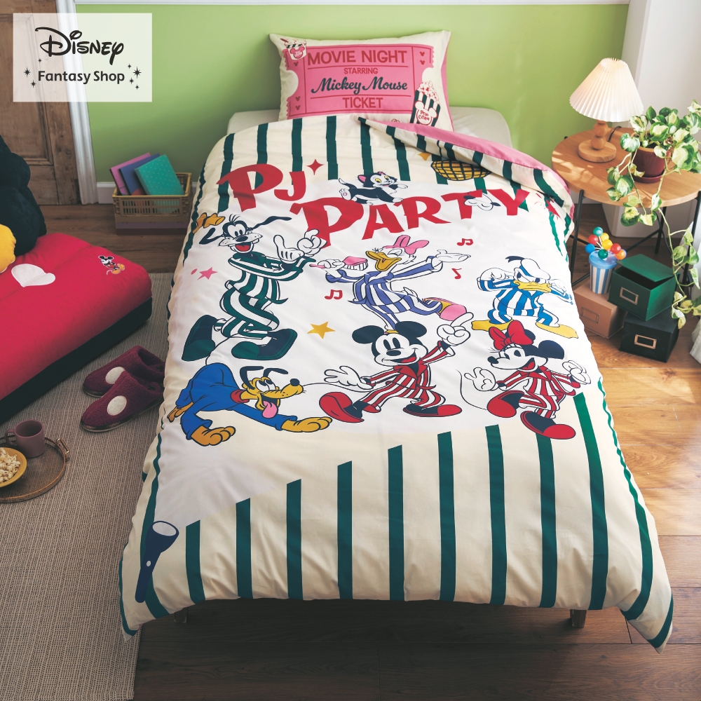─デザイン・スタイリング─・お揃いの色違いパジャマでパーティをするミッキー & フレンズが愉快なデザイン・賑やかなデザインの掛け布団カバーとパーティチケットデザインの枕カバーの2点セット─素材─・オールシーズン快適な綿素材