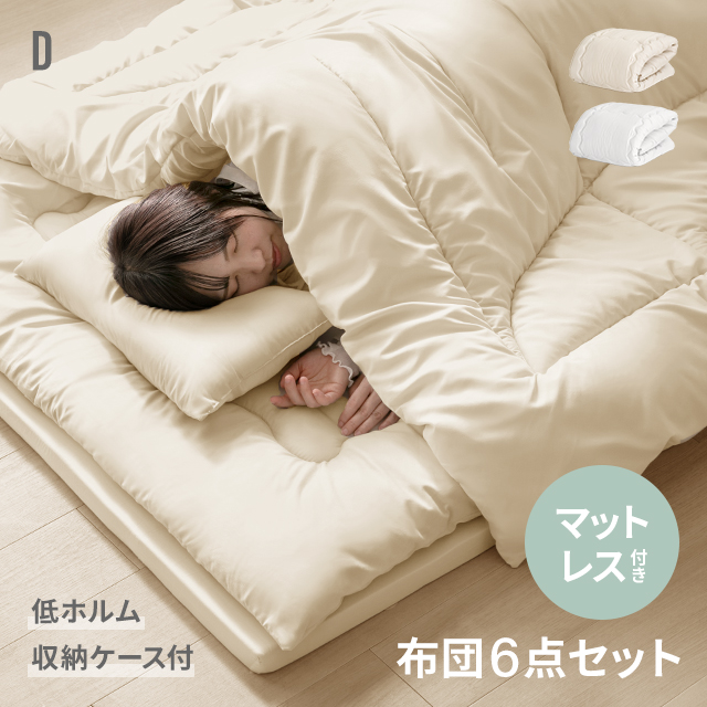 送料無料 【配送について】 商品の配送は全て宅配便での玄関渡し(集合住宅の場合は1階エントランス渡し)となります 【セット内容】 マットレス×1 掛け布団×1 敷き布団×1 枕×2 収納袋×1