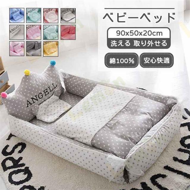 この商品について本体:コットン100% 適用年齢:0?24ヶ月 重さ:1.2kg サイズ:90*55*15cm *布団や付属品は全て衛生的な圧縮パック梱包されています。「枕・掛け布団付き」+「防水シーツ・袋」付き。四角い作りで広々としている為、おむつ交換もとても楽!寝返りもしやすく赤ちゃんがゆったり過ごせます。「防水シーツ付き」で長時間のねんねや寝返りも安心。360℃赤ちゃんを保護してくれ、ママも赤ちゃんも一緒に安心して寝られます。持ち運びやすく、どこでも赤ちゃんの寝るスペースを作ることができます。(赤ちゃんを乗せたまま移動はしないようご注意ください)リボン部分の取り外し可能・布団カバーともに取り外し可能(洗濯可能)可愛いデザイン・袋付きで、出産祝いやプレゼントにも最適です。●写真と実際の商品の色は 多少異なる場合がございます。製品は不定期にアップグレードされます。生産ロットによって外観が変わる場合がありますので、購入前にご了承ください。何かご不明な点、ご要望などございましたら、メールにてお気軽に問い合わせください。
