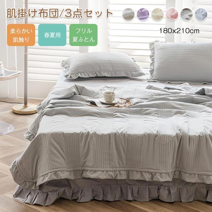■布団セット 3点セット 掛け布団 ダブル フリル付き かけ布団 肌掛布団 肌布団 枕カバー 無地 洗える 清潔 キルトケット ひんやり 涼しい