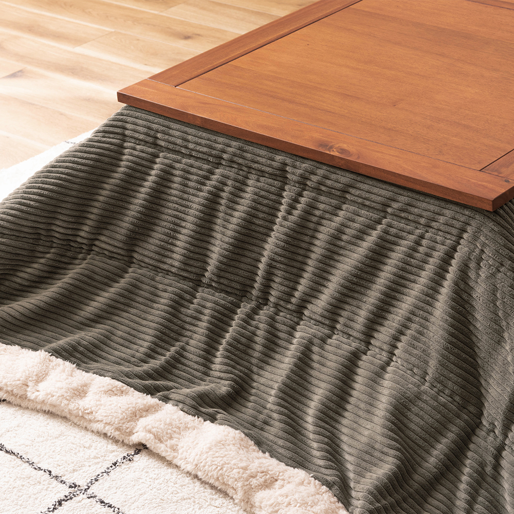 [こたつテーブル]レトロな表情を見せるアカシア材を贅沢に使用オイル塗装仕上げで木の風合い感じる素敵な佇まいに仕上げています正方形は75×75cmの4面使えるちょうど良いサイズ感コンパクトでも対面使用が出来る正方形の定番サイズ長方形は幅105×奥行60cmのソファー前でも使いやすい奥行コンパクトサイズヒーターはベーシックな石英管ヒーターヒーター横のつまみを回すことで温度の強弱が切り替えできます手元のスイッチでヒーターのON/OFFの操作が可能直線を活かしたシンプルなラインが天然木の優しい風合いでやわらかな印象にデザインされています[こたつ布団]セットで購入できるこたつ布団はボアの縁取りがおしゃれなカジュアルで飽きのこないコーデュロイ生地厚み約2cmのすっきり使いやすい薄掛けタイプお好みに合わせてこたつテーブルのみ、布団付きをお選びください
