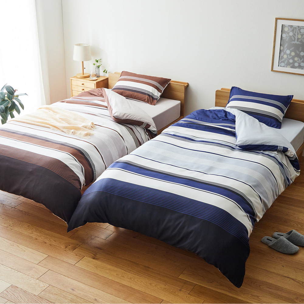 掛け布団カバー、枕カバー、兼用シーツの3点セットでお届け掛布団カバーはボーダー柄でお部屋の雰囲気をシンプルで落ち着いたモダンテイストに(掛け布団カバーの裏地、兼用シーツは、無地カラーになります)選べる2色展開ですお気軽にお洗濯できます