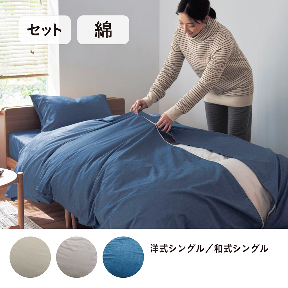 ーデザイン・スタイリングー・掛け布団カバー、シーツ、枕カバーの3点が一度に揃うセットー素材ー・奥行きのある風合いの先染め綿素材を使用・綿なのに洗濯後も乾きやすい・年中さらりと心地よく使えるー機能ー・付け替えの手間を極力少なくした、こだわり仕様のカバー・中央にファスナーがあるので、上下・左右の位置がわかりやすく、4隅まで手が届きやすい・ダブルファスナーで開閉らくらく・着脱簡単な4隅スリット・スナップボタン式