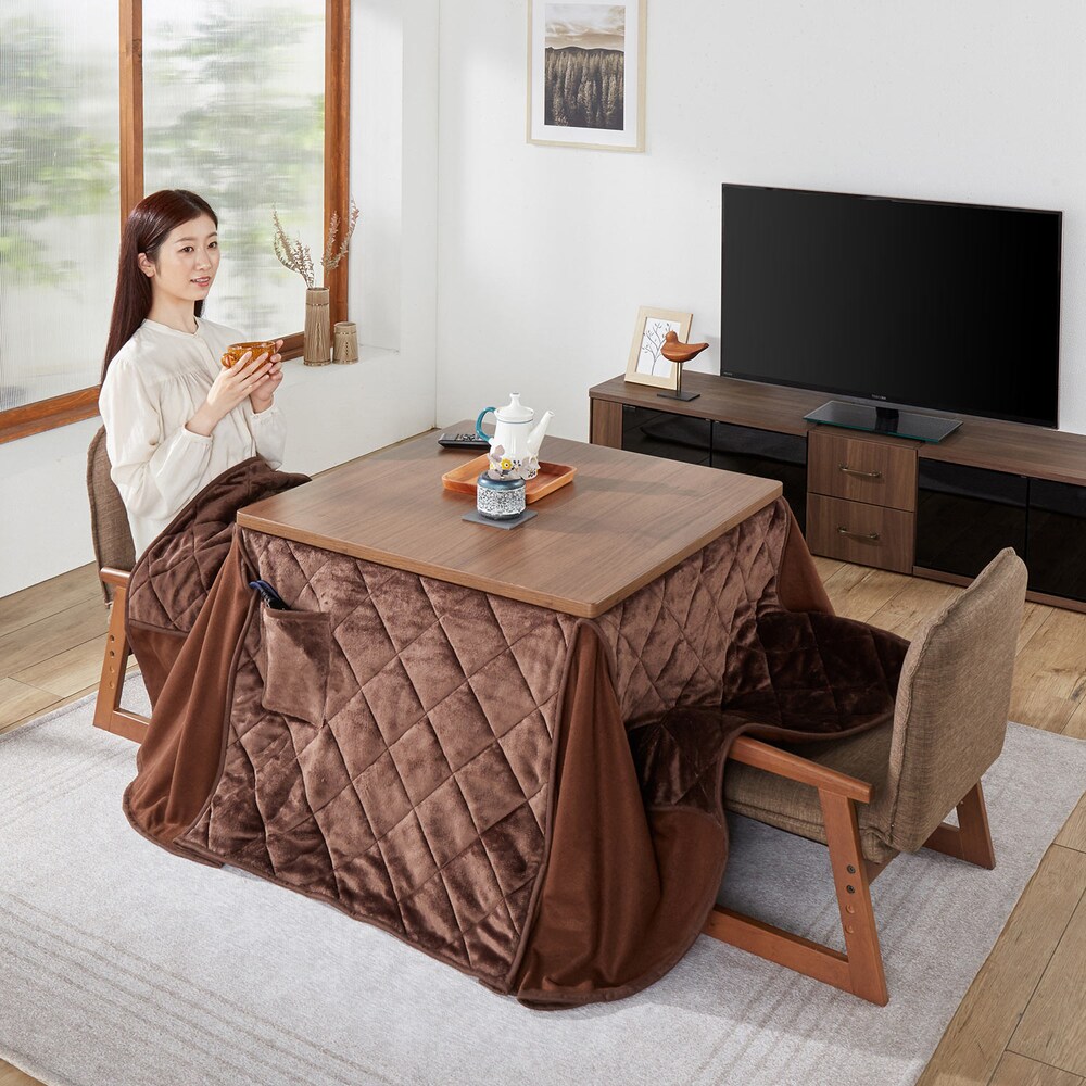 木目調の本体、チェア、こたつ布団をセットにしましたこたつ脚部は継ぎ脚仕様でお好みの高さでお使いいただけますオフシーズは天板下にリモコンやコードなどを収納OKチェアの座面は21~27cmまで3cmピッチで3段階の調節が可能また使わないときはチェアの背もたれを折りたため、こたつ本体に格納することができますこたつ布団のサイドにはポケットがあるので、スマホやリモコンなどの収納にも便利ですコンパクトな梱包で玄関スペースが狭いお家にもオススメ