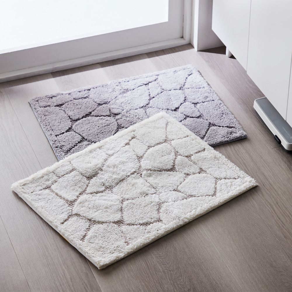 人気のホワイトインテリアやホテルライクな空間に合うデザイン石畳の凸凹を織りで表現し、シンプルでバスルームに馴染むように色の見え方にこだわっていますカラーは清潔感のあるホワイトと、ストーンらしいクールなグレーの2色展開