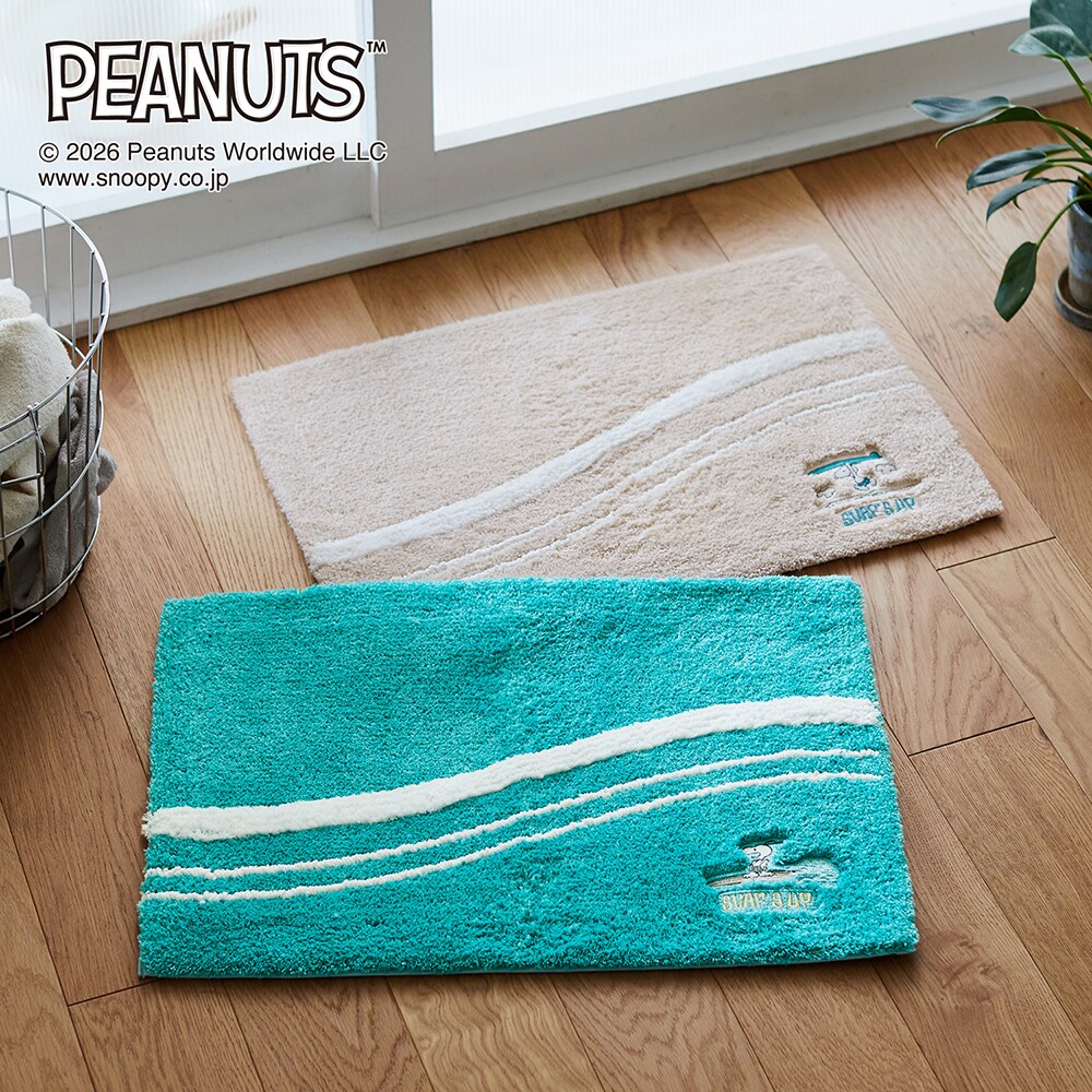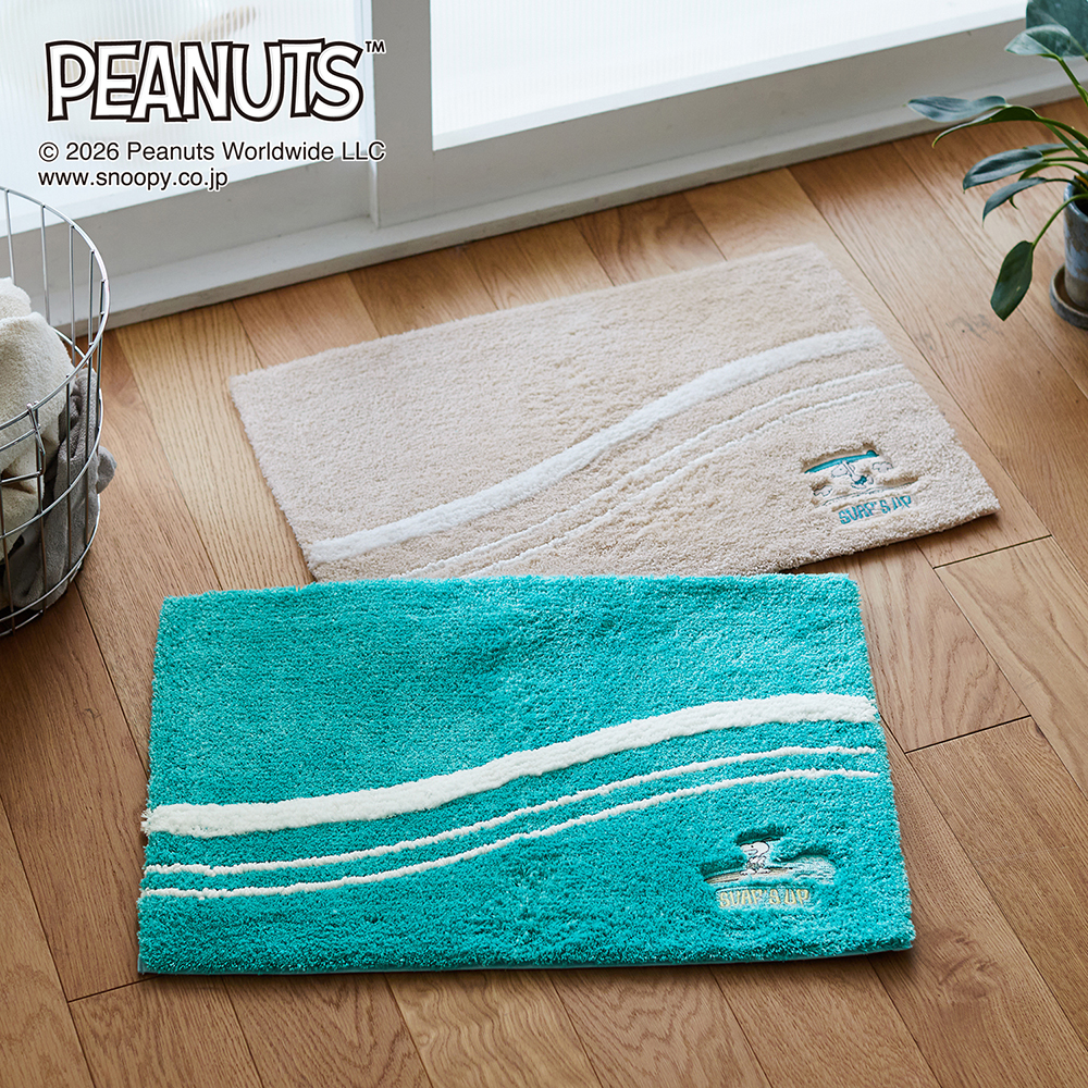 ─デザイン・スタイリング─・バスまわりの空間を爽やかに演出してくれるバスマット・パイル地にスヌーピーの刺繍がワンポイント・スヌーピーのパンツの柄や波しぶきなど、細部にまで凝った刺繍・パイルには2種類の糸を使い、色味にニュアンスを演出・海の色を感じさせるブルー系は、曲線のデザインで波を表現・ベージュ系は、砂浜をイメージした色使いと曲線のデザインがポイント─機能─・裏面はすべりにくい加工