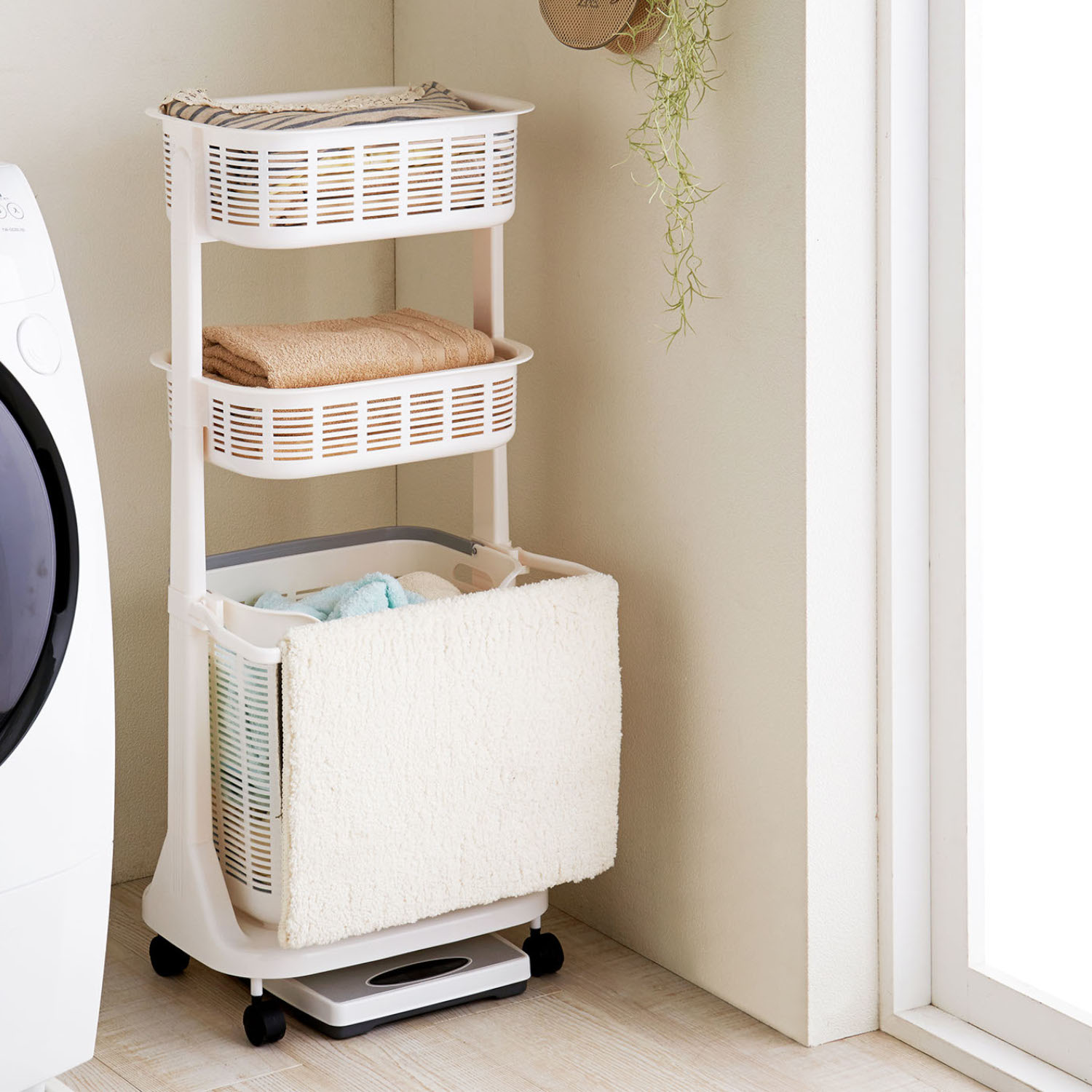 サニタリースペースでタオルや洗濯物の収納に活躍するランドリーバスケットに、バスマット干しが付きました!長さ47cmまでのバスマットをキレイに干すことができます下段の深いバスケットは持ち手つきで持ち運びができ、前方が少し下がっているので出し入れしやすいのが特長本体にはキャスターが付いているから移動もらくちんです2段タイプの「A」と、3段タイプの「B」の2種類からお選びください