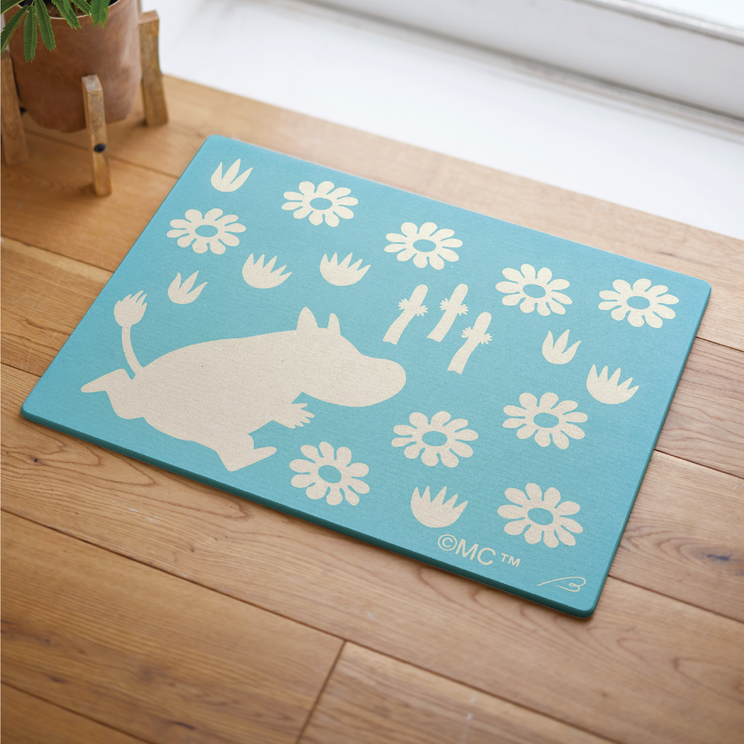 ーデザインー・北欧調のきれいなブルーに染めたバスマット・お花畑で遊ぶムーミンが愛らしいー機能ー・洗う手間がいらず、足元いつもサラッと快適・日本製ー素材ー・吸水性に優れた珪藻土を使用