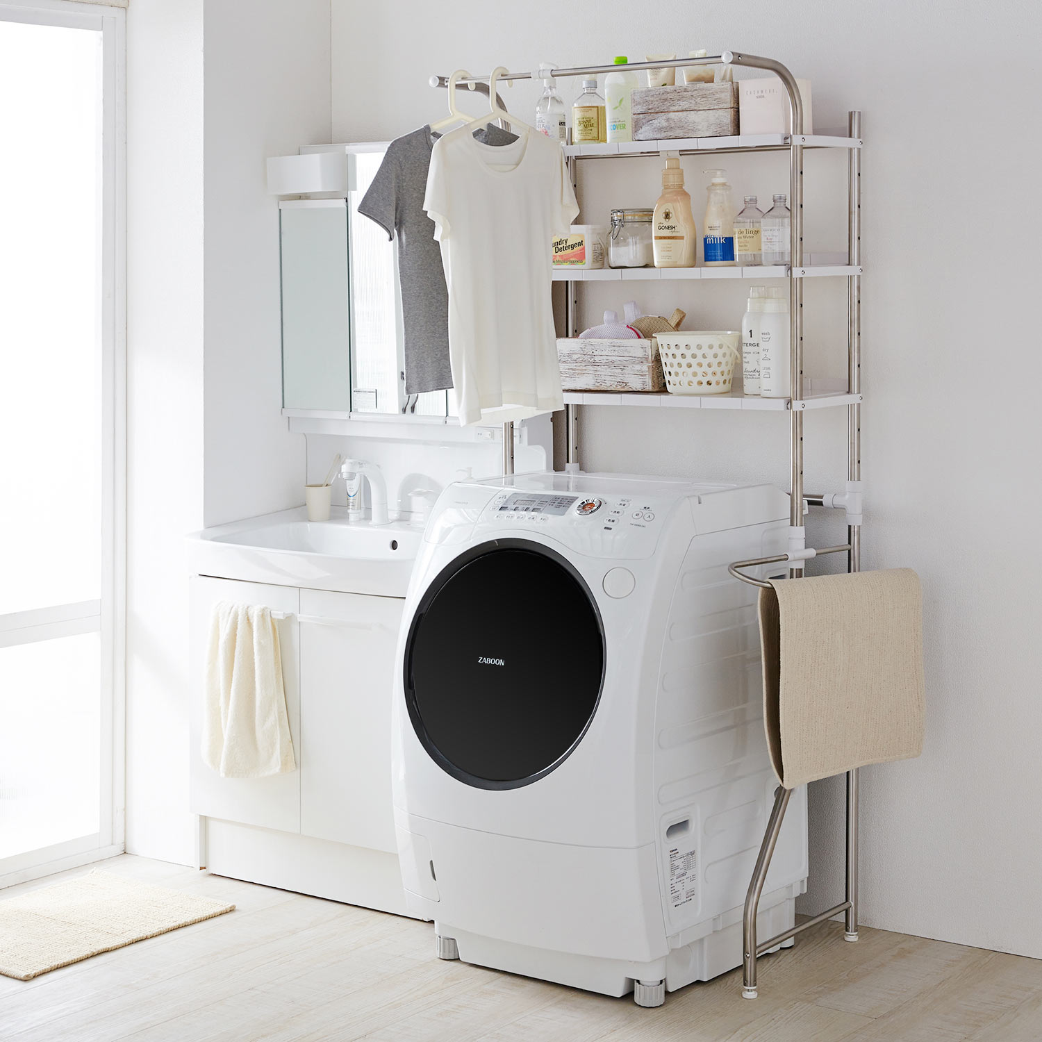 洗濯機まわりを快適にするランドリーラックお使いの洗濯機に合わせてラック幅は60~90cmに調節可能上部は干す前の洗濯物を掛けるのに便利なハンガーバー付き棚部には洗剤類やバスケットを置くことができ、棚板は取り外しすることができます棚部は7cmピッチで高さ調節可能また、サイドにはバスマットを干すのに重宝するバー付きで、使わない時は折りたたみOKステンレスで錆びにくいから長く愛用することができます