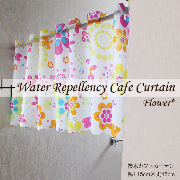 ■カフェカーテン 撥水加工 約145×45cm 花柄 ホワイト 在宅勤務