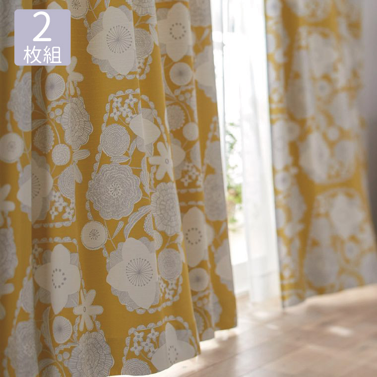 ■遮光 カーテン 約幅100cm×長さ135cm×2枚セット イエロー 花柄 3級遮光 洗える 形状記憶 裏地付き タッセル付き 遮光カーテン
