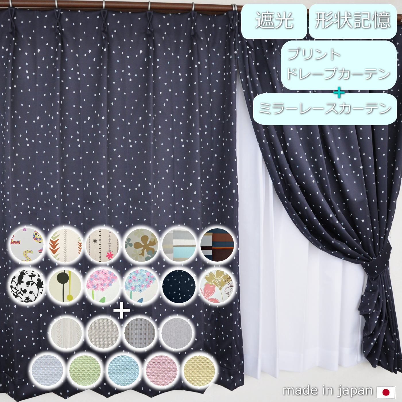 ■【送料無料】カーテン4枚セット 遮光 断熱性抜群で省エネ効果 形状記憶加工 遮熱カーテン2枚+ミラーレース2枚 プリント柄 花柄