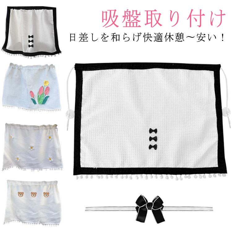 ■車 吸盤取り付け カーテン UVカット 車内カーテン ベビー 日よけ リア席サイド用 花柄 リボン らくらく簡単カーテン サイドカーテン 車中