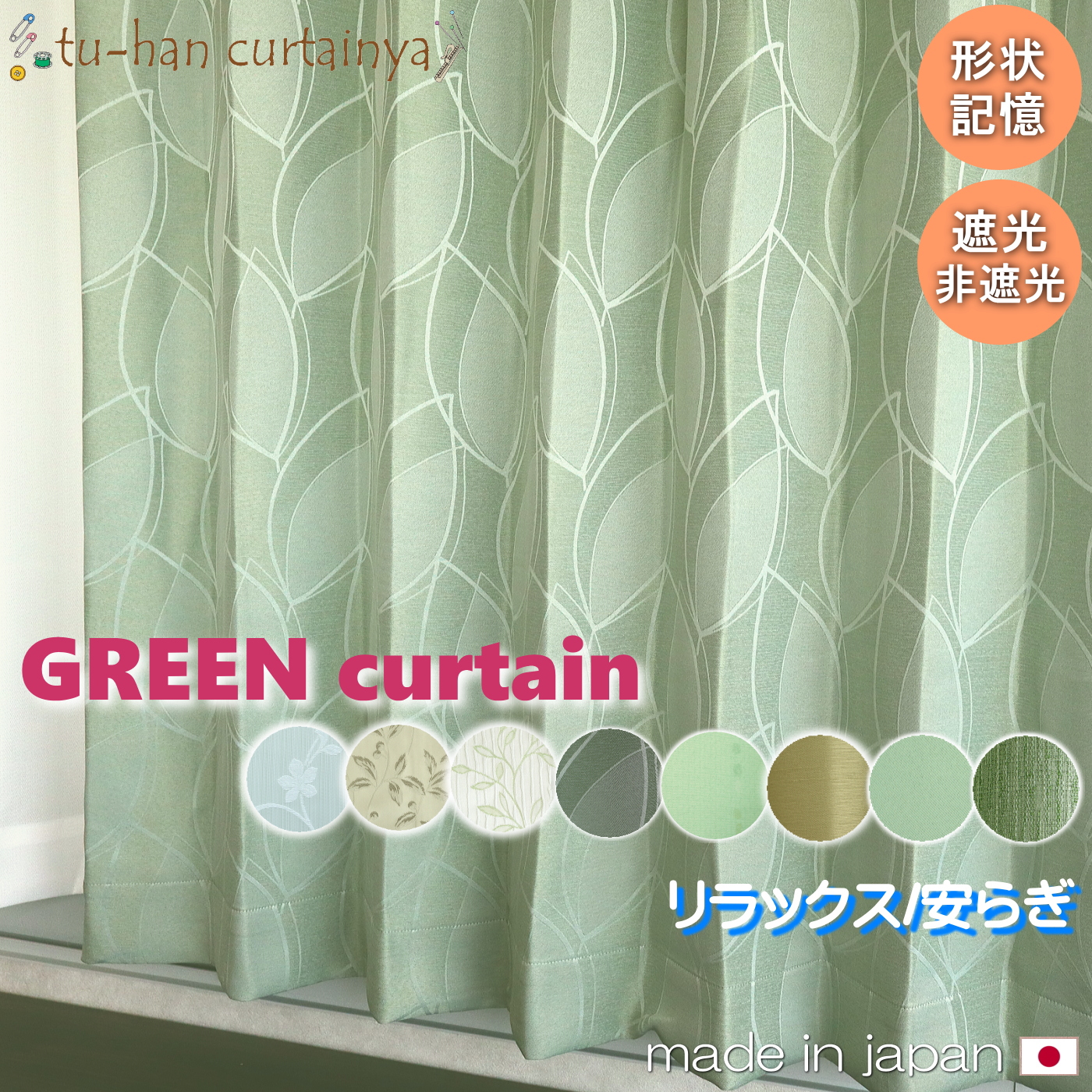 ■【日本製】カーテン 遮光 3級 形状記憶加工 1級 非遮光 花柄 おしゃれ【グリーンカーテン】 葉柄 ブルー 総柄 グリーン 和室 寝室 目隠