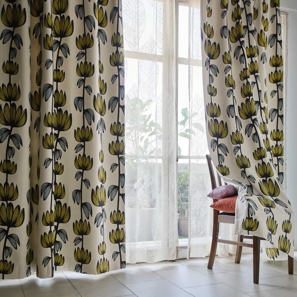 繊細な葉模様が美しいレースカーテン「カイホ」、ニュアンスカラーの大胆な花柄が人気の遮光カーテン「アルマ」を合わせて。お部屋に北欧のお庭を。