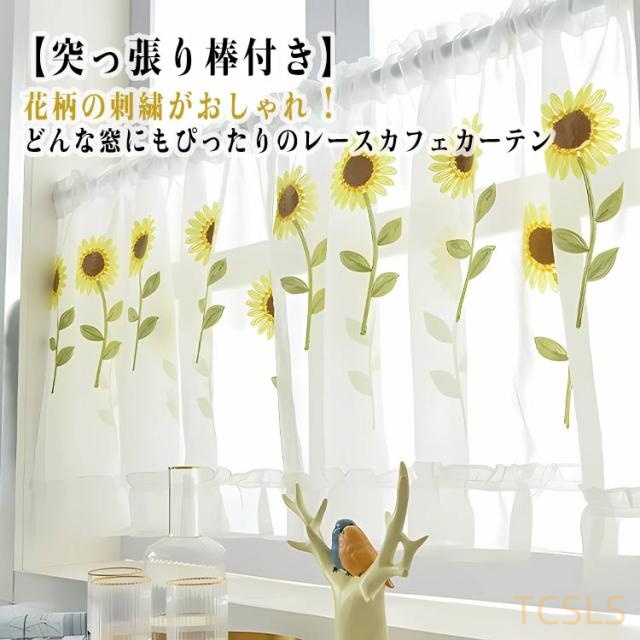 ■【突っ張り棒付き】 模様替え カーテン カフェカーテン 刺繍 間仕切り おしゃれ 北欧 レースカーテン 小さい窓 ロング丈 小窓カーテン 花