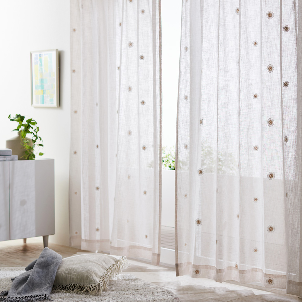 お部屋に優雅なアクセントを加えるレトロ感のある刺繍カーテン大きな花柄のワッペン刺繍がエレガントな雰囲気を演出し、ナチュラルなインテリアからクラシックな空間まで、幅広いスタイルにマッチします繊細で立体感のある刺繍が高級感をプラス、やさしい雰囲気を演出します適度な透け感が光を柔らかく取り込み、お部屋を明るく心地よい空間にシンプルながら華やかさを感じるデザインで、さまざまなインテリアに馴染みます季節を問わず使いやすい、上品で温かみのある刺繍カーテン