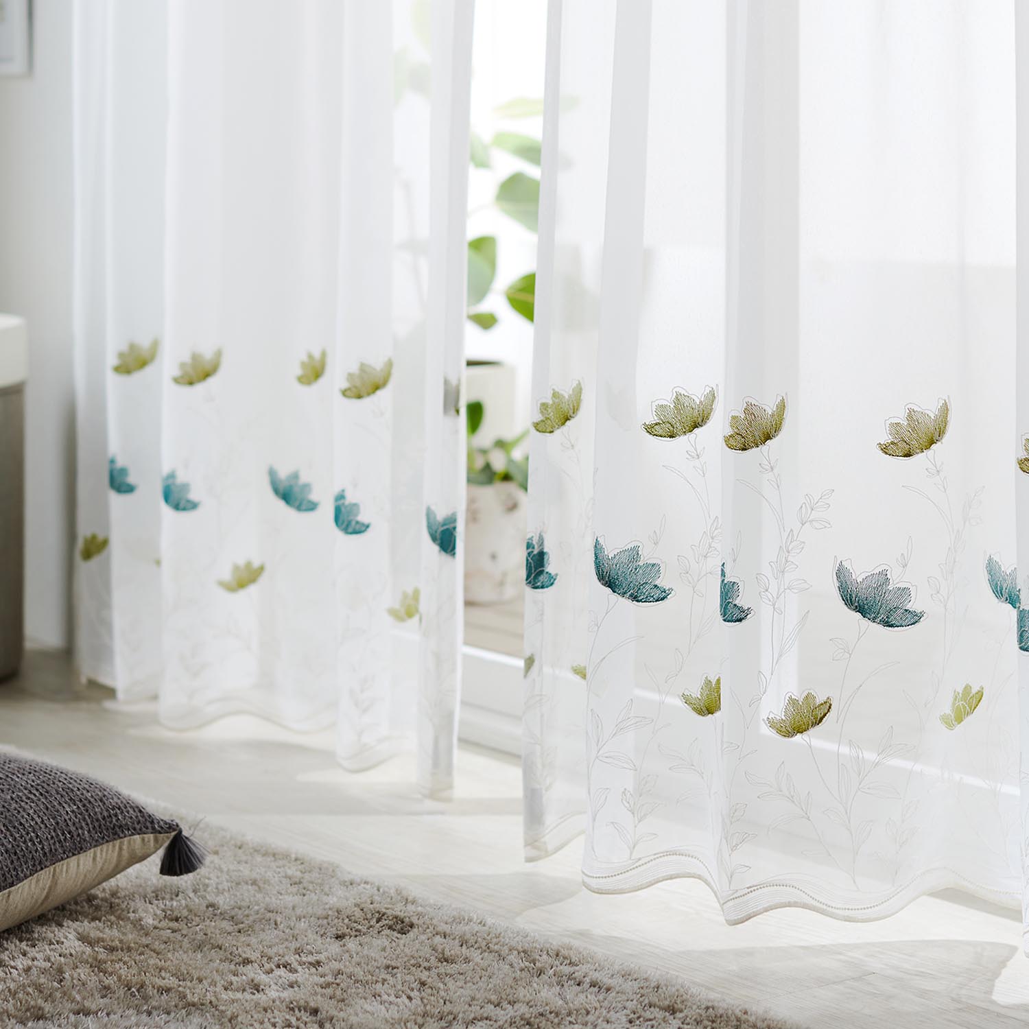 ナチュラルな風合いのスパンボイルのベース生地に、カジュアルでフレッシュな印象の花柄を、ブルーグリーンとピスタチオグリーンのバイカラーづかいで仕上げた、裾絵羽刺繍レースですナチュラル、北欧テイストのお部屋に最適で、明るく華やかな窓辺を演出します裾は絵羽柄でデザインが楽しめます
