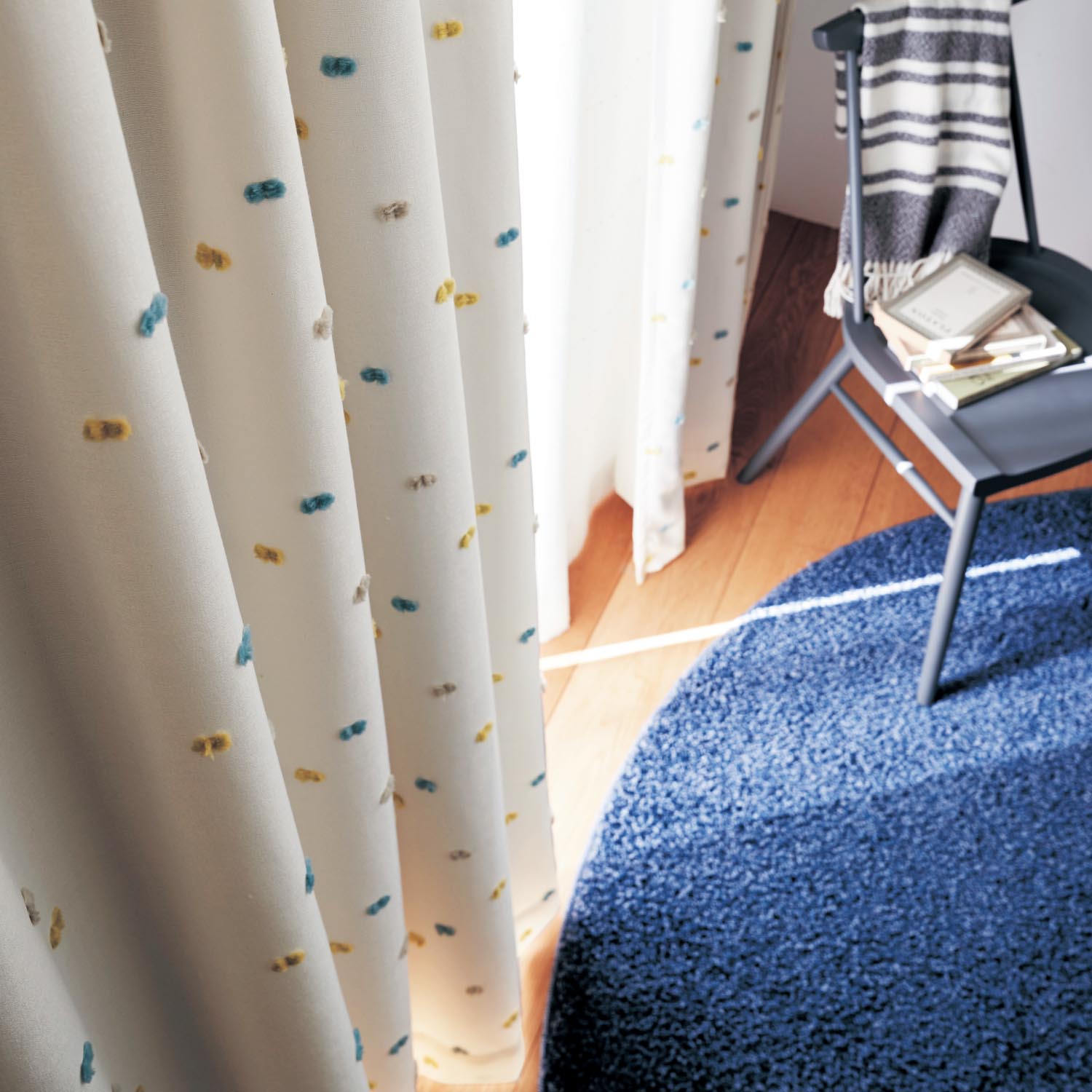 コーティングされた厚手の生地を裏側に2枚合わせすることで高い機能性を実現昼間も室内に光が入りにくい遮光機能をプラス冷暖房効率がアップする遮熱効果防音効果も付いた頼もしいカーテン立体的に浮き上がった、ふわふわのぽんぽんが窓辺のキュートなアクセントに好みや室内の雰囲気に合わせて選べるカラー展開です2枚合わせ仕様のため重みがあり風によってなびきにくい【しっかり光を遮る 1級遮光】~室内が真っ暗になり、隣にいる人の顔が識別できないレベル~ 一級遮光カーテンは、寝室を暗くして睡眠をしっかりとりたい方、朝日や強い西日を遮りたい方におすすめです【騒音問題とさようなら 防音効果】~室内の音、室外の音を軽減~ 外に漏れたくないテレビの音や赤ちゃんの泣き声、ピアノの音などの生活音を軽減します また外から入ってくる車の音や犬の鳴き声を軽減します※データおよび性能は無響試験室、音域別の結果ですので、一般環境とは感じ方に差異がございます【年中快適に 遮熱・保温効果】~夏は遮熱、冬は断熱保温効果。冷暖房効率もアップし、節電し省エネ、室内を快適に~ 夏の直射日光熱をカットし、室温の上昇を抑えます 冬は保温、冬の外の冷気をカットし、室温の低下を防ぎます