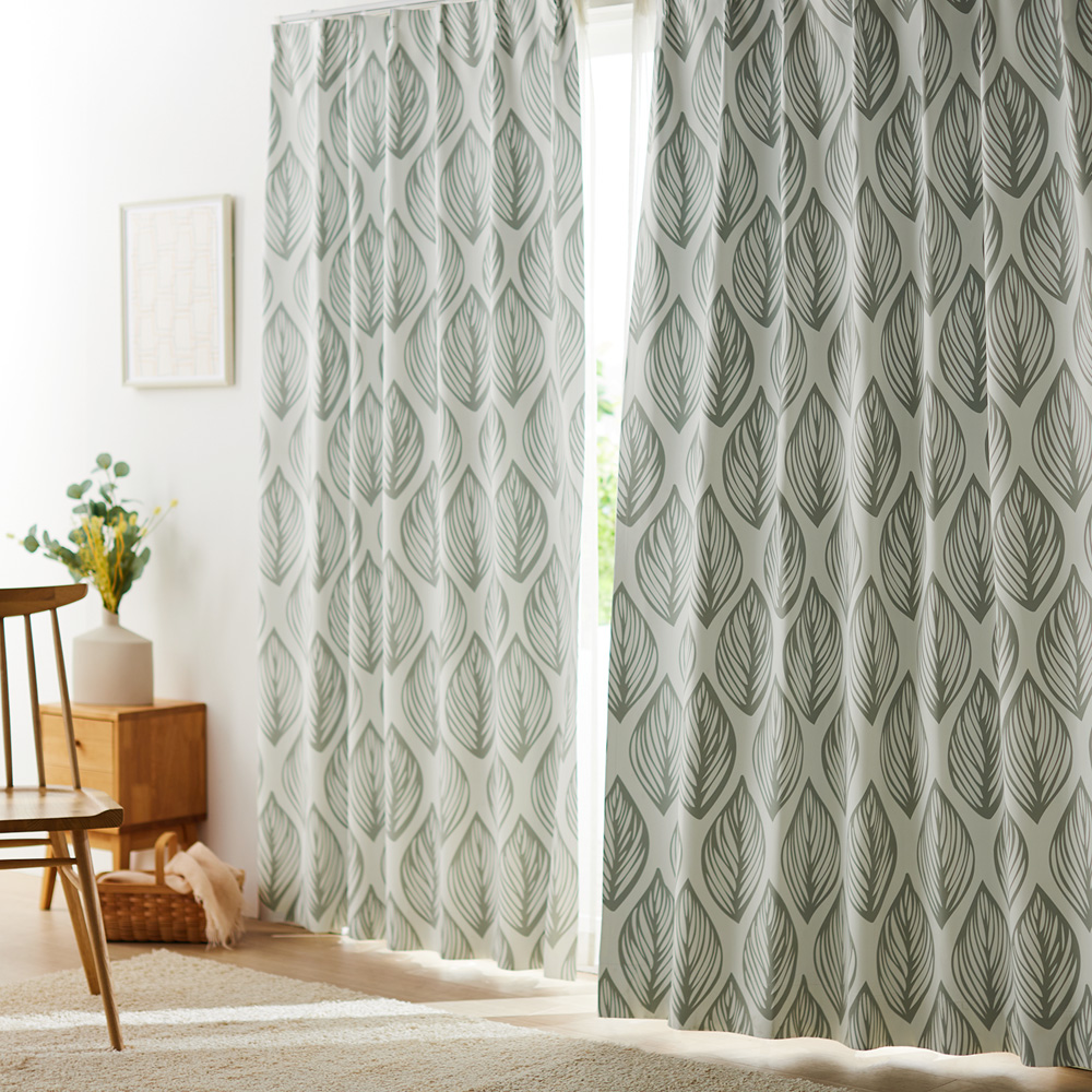 北欧風インテリアはもちろん、カジュアルなインテリアに合わせやすいリーフ柄です生地と生地の間にアクリル樹脂をはさむことにより、遮光率100%を実現中間層のアクリルは3層(白+黒+黒)で表生地と裏生地を合わせて5層の生地で断熱性・保温性・遮音性を高めています【しっかり光を遮る 1級遮光】~室内が真っ暗になり、隣にいる人の顔が識別できないレベル~1級遮光カーテンは、寝室を暗くして睡眠をしっかりとりたい方、朝日や強い西日を遮りたい方におすすめです【騒音問題とさようなら 防音効果】~室内の音、室外の音を軽減~外に漏れたくないテレビの音や赤ちゃんの泣き声、ピアノの音などの生活音を軽減しますまた外から入ってくる車の音や犬の鳴き声を軽減します※データおよび性能は無響試験室、音域別の結果ですので、一般環境とは感じ方に差異がございます【年中快適に 遮熱・保温効果】~夏は遮熱、冬は保温効果。冷暖房効率もアップし、節電し省エネ、室内を快適に~夏の直射日光熱をカットし、室温の上昇を抑えます冬は保温、冬の外の冷気をカットし、室温の低下を防ぎます