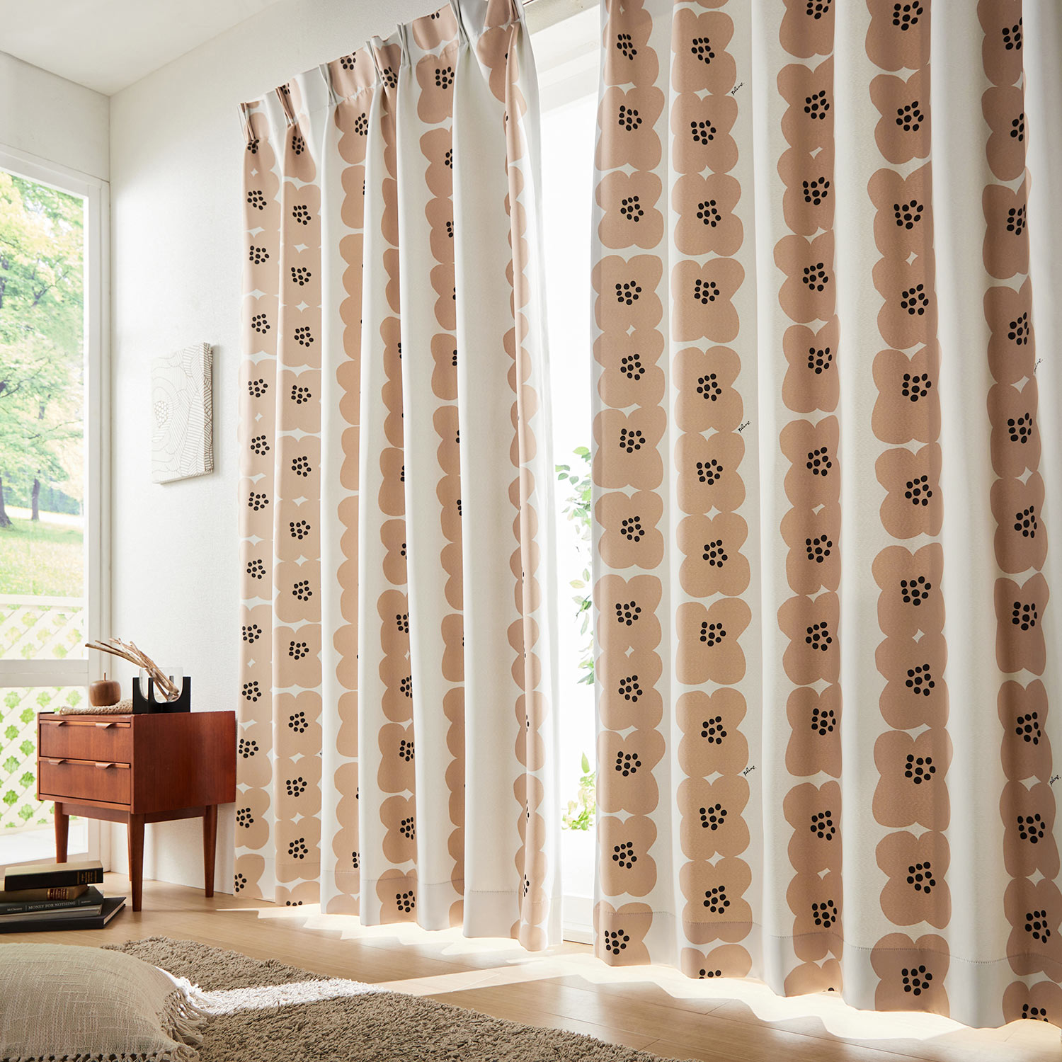 ーデザイン・スタイリングー・スヌーピー×サークルのプリント柄がおしゃれ・吊るすだけで品よく可愛く窓辺の印象を一新・シックな色調で主張しすぎないので取り入れやすいー機能ー・光をカットする遮光機能付きで寝室にも◎・洗濯機で手軽に洗えてお手入れもスムーズ~夏は遮熱、冬は断熱保温効果。冷暖房効率もアップし、節電し省エネ、室内を快適に~夏の直射日光熱をカットし、室温の上昇を抑え冬は保温、冬の外の冷気をカットし、室温の低下を防ぐ