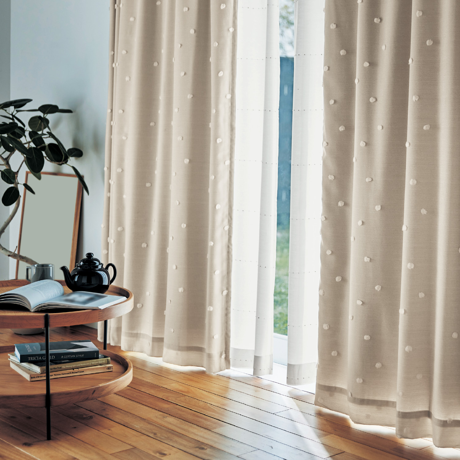 コーティングされた厚手の生地を裏側に2枚合わせすることで高い機能性を実現昼間も室内に光が入りにくい遮光機能をプラス冷暖房効率がアップする遮熱効果防音効果も付いた頼もしいカーテン立体的に浮き上がった、ふわふわのぽんぽんが窓辺のキュートなアクセントに好みや室内の雰囲気に合わせて選べるカラー展開です2枚合わせ仕様のため重みがあり風によってなびきにくい【しっかり光を遮る 1級遮光】~室内が真っ暗になり、隣にいる人の顔が識別できないレベル~ 一級遮光カーテンは、寝室を暗くして睡眠をしっかりとりたい方、朝日や強い西日を遮りたい方におすすめです【騒音問題とさようなら 防音効果】~室内の音、室外の音を軽減~ 外に漏れたくないテレビの音や赤ちゃんの泣き声、ピアノの音などの生活音を軽減します また外から入ってくる車の音や犬の鳴き声を軽減します※データおよび性能は無響試験室、音域別の結果ですので、一般環境とは感じ方に差異がございます【年中快適に 遮熱・保温効果】~夏は遮熱、冬は断熱保温効果。冷暖房効率もアップし、節電し省エネ、室内を快適に~ 夏の直射日光熱をカットし、室温の上昇を抑えます 冬は保温、冬の外の冷気をカットし、室温の低下を防ぎます