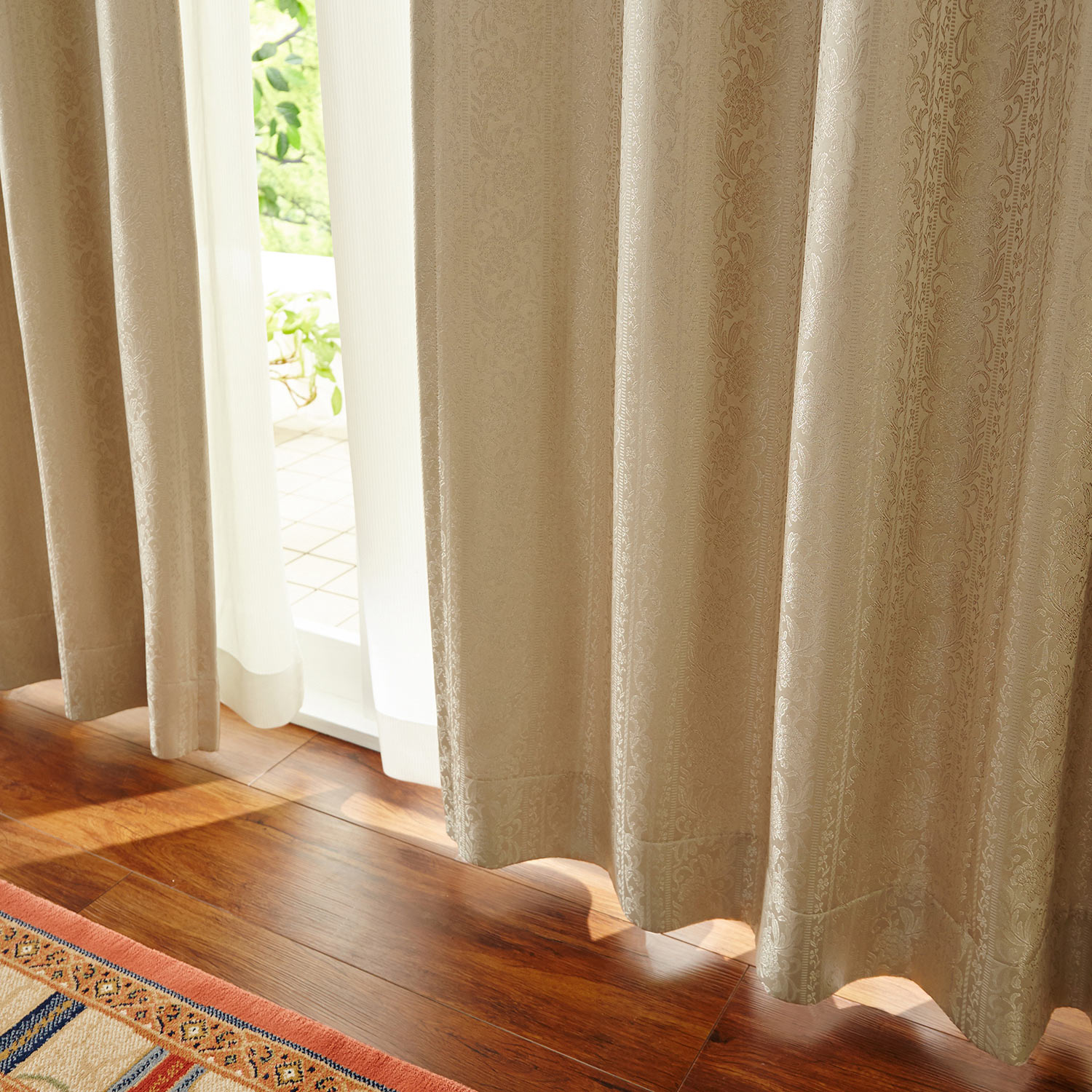 ジャカード織りのエレガントな雰囲気のカーテンアンティークなデザインがさりげなくお部屋を飾ります光を遮る遮光機能付き形態安定加工で美しいドレープも魅力万が一のときも燃え広がりにくい防炎機能付き【光を遮る 2級遮光】~室内が暗くなるが、隣の人の顔や表情は識別できるレベル~2級遮光カーテンは、室内の様子をわかりにくくしたい方、朝日や強い西日を和らげたい方におすすめです【きれいな見栄え 形態安定】~美しいドレープが裾まで広がらずきれいにまとまる~生産過程で生地をきれいなドレープの形になるように加工しています未加工品に比べお洗濯後も吊った時にきれいな見栄えが続きます【高層建築物には義務がある 防炎機能】~万が一の時も燃え広がりにくい~小さなタバコなどの火でもすぐに燃え広がり第家事になる可能性もあります防炎カーテンは、消防法で定める基準以上の防炎性能を持ち、万一の時も安心です