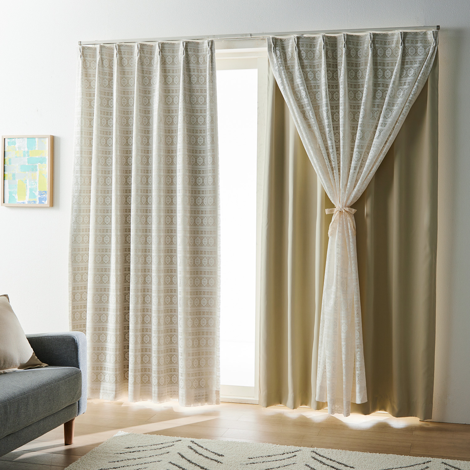厚地ドレープ生地と繊細な刺繍風レース生地を上部で縫製した二重カーテンレース生地だけ束ねる・厚地生地だけ束ねることで違った雰囲気を楽しむことができます厚地生地は「遮光機能」、冷暖房効率を高める「遮熱機能」を兼ね備えていますなめらかな肌ざわりと、窓の外から見える裏面までしっかり発色しているのもポイントですタッセルは厚地と同生地です洗濯OKで、いつでも清潔【年中快適に 遮熱・保温効果】~夏は遮熱、冬は断熱保温効果。冷暖房効率もアップし、節電し省エネ、室内を快適に~ 夏の直射日光熱をカットし、室温の上昇を抑えます 冬は保温、冬の外の冷気をカットし、室温の低下を防ぎます