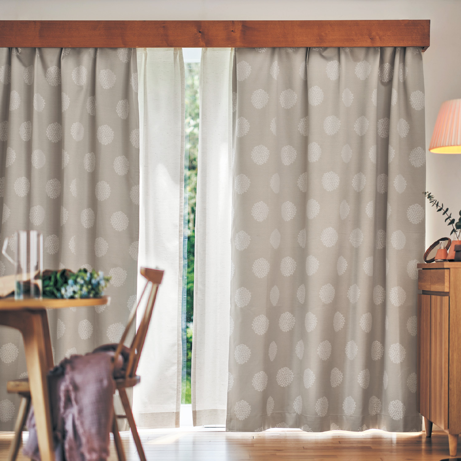 北欧テイストのサークルモチーフ柄まるで刺繍したような刺し子デザイン凹凸のある豊かな質感空間になじむシックな色合い裏面はアクリル樹脂コーティングで完全遮光1級遮光・遮熱・防音機能付きリビングはもちろん子供部屋にもおすすめ【しっかり光を遮る 1級遮光】~室内が真っ暗になり、隣にいる人の顔が識別できないレベル~ 一級遮光カーテンは、寝室を暗くして睡眠をしっかりとりたい方、朝日や強い西日を遮りたい方におすすめです【騒音問題とさようなら 防音効果】~室内の音、室外の音を軽減~ 外に漏れたくないテレビの音や赤ちゃんの泣き声、ピアノの音などの生活音を軽減します また外から入ってくる車の音や犬の鳴き声を軽減します ※データおよび性能は無響試験室、音域別の結果ですので、一般環境とは感じ方に差異がございます【年中快適に 遮熱・保温効果】~夏は遮熱、冬は保温効果。冷暖房効率もアップし、節電し省エネ、室内を快適に~ 夏の直射日光熱をカットし、室温の上昇を抑えます 冬は保温、冬の外の冷気をカットし、室温の低下を防ぎます