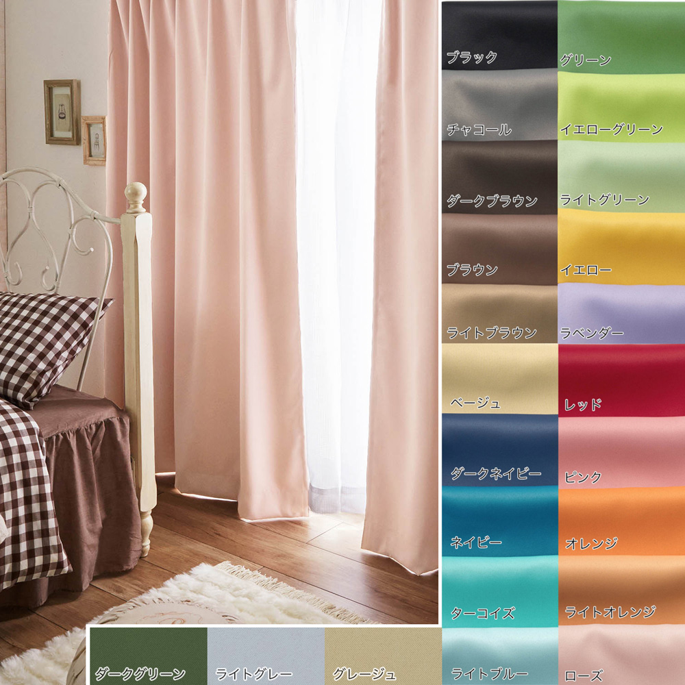 美しい色合いのカラーが多彩に揃い、お部屋にぴったりの1枚が見つかる無地の高機能カーテン遮光、遮熱、防炎機能がついた、快適 & 安心して使える国産品です生地表面はサラリと光沢感のある糸を使い、柔らかな生地感で、生地裏面も同系色カラーにした、上質な仕上がりです【しっかり光を遮る 1級遮光】~室内が真っ暗になり、隣にいる人の顔が識別できないレベル~ 1級遮光カーテンは、寝室を暗くして睡眠をしっかりとりたい方、朝日や強い西日を遮りたい方におすすめです【光を遮る 2級遮光】~室内が暗くなるが、隣の人の顔や表情は識別できるレベル~ 2級遮光カーテンは、室内の様子をわかりにくくしたい方、朝日や強い西日を和らげたい方におすすめです【きれいな見栄え 形状記憶】~美しいドレープが裾まで広がらずきれいにまとまる~ 生産過程で生地をきれいなドレープの形になるように加工しています 未加工品に比べお洗濯後も吊った時にきれいな見栄えが続きます【高層建築物には義務がある 防炎機能】~万が一の時も燃え広がりにくい~ 小さなタバコなどの火でもすぐに燃え広がり大火事になる可能性もあります 防炎カーテンは、消防法で定める基準以上の防炎性能を持ち、万一の時も安心です【年中快適に 遮熱・保温効果】~夏は遮熱、冬は断熱保温効果。冷暖房効率もアップし、節電し省エネ、室内を快適に~ 夏の直射日光熱をカットし、室温の上昇を抑えます 冬は保温、冬の外の冷気をカットし、室温の低下を防ぎます