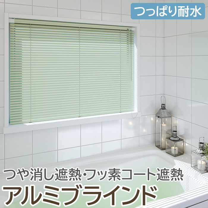 ※北海道・沖縄県・離島は別途送料がかかります。 カーテンにはない、光の微妙なコントロールが可能なブラインド。 フッ素コートスラットは、汚れを簡単に落とせるお手入れ簡単なスラット! 水廻りにもオススメです。 浴室タイプは工具なしで簡単取付。 タイルなどでネジが使えない浴室におすすめ。 突っ張り式で簡単にしっかり固定します。 サビにくい上、スラットの上下をコードで押さえることで、 水滴がついてもスラット同士がくっつくことがなく、昇降・開閉操作がスムーズに行えます。 ※ 取付は突っ張り式です。 ※ 最大製作可能面積は 3.24m2 です。