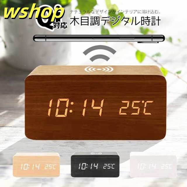 置き時計 デジタル時計 目覚まし時計 おしゃれ 置時計 卓上時計 ワイヤレス充電器 木目時計 LEDデジタル