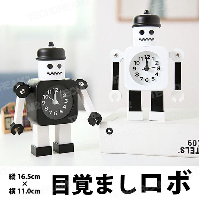 ■子供用 置き時計 目覚まし時計 目覚まし ロボット 時計 アラーム キャラクター 卓上 置時計 ホワイト 黒 モノトーン 白 おしゃれ 北欧 イ