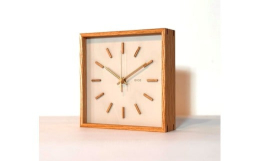 枠、インデックスにはオークの無垢材を使用。文字盤はメラミンを使用。文字盤はホワイト。針はアルミ製、基本真鍮色。楽器製作、家具製作の過程で大きさ的に使用できず捨ててしまうのはもったいない高級材の端材を生かすことは出来ないかという発想から生み出された製品です。天然木の無垢材なので手触り、香り、色味を存分に楽しんでいただけるように一切着色はせずクリアオイル仕上げになっています。同じ木目は存在せず唯一無二の無線(Wi-Fi)時計です。自宅やオフィスなど色々な場所に合わせやすい時計です。置時計、壁掛け時計、部屋に合わせて自由に設置できる兼用タイプ。贈り物などにも喜ばれます。枠、インデックス部分はオーク材、文字盤はメラミンを使用。塗装はオスモカラー仕上げ。天然木本来の色味、風合いを感じられま