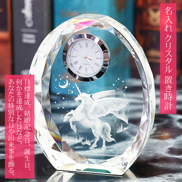 ■自分ご褒美 クリスタル 置き時計 ペガサス 名入れメモリアル 卓上時計 置時計 誕生日 結婚記念日 目標達成 記録達成 ホールインワン エイ