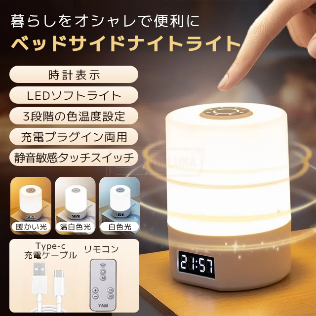 ■最安挑戦 冬新作 送料無料 新作 ベッドサイドナイトライト LED 目覚まし時計 3段階調光 3色切替 寝室 USB充電式 省エネ 小型 ベッドサイ