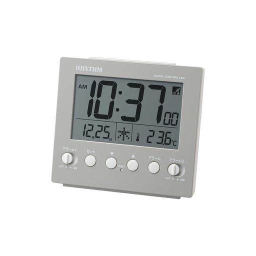 ■リズム(RHYTHM) 目覚まし時計 電波時計 デジタル 電子音 ダブル アラーム (スヌーズ 付) 温度計 ライト カレンダー グレー 9.1×10×4.5C