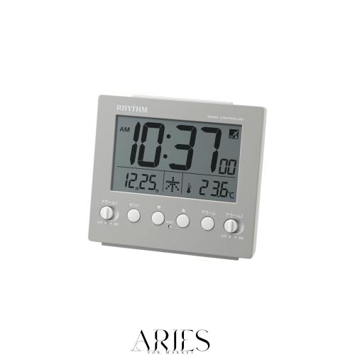 ◆商品名:リズム(RHYTHM) 目覚まし時計 電波時計 デジタル 電子音 ダブル アラーム (スヌーズ 付) 温度計 ライト カレンダー グレー 9.1×10×4.5c