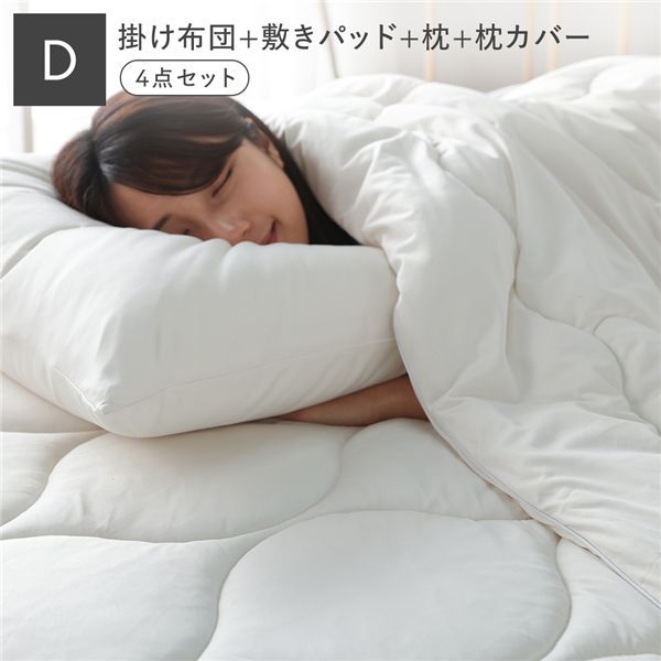 寝具 4点セット 掛け布団 + 敷きパッド + 枕 + 枕カバー ダブル ミルク 洗える 抗菌防臭 保温 低ホルムアルデヒド