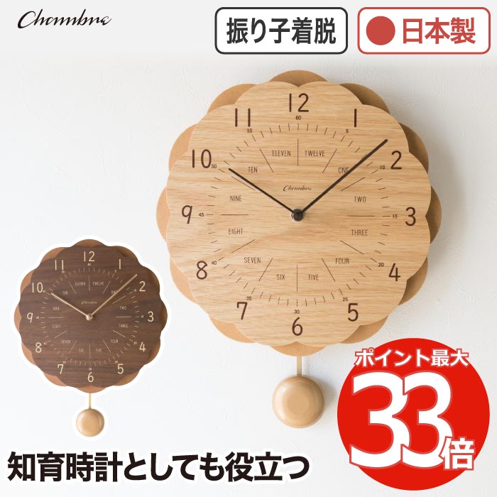 ■掛け時計 おしゃれ 振り子時計 木製 2WAY アナログ SUN CLOCK シャンブル CHAMBRE 知育時計 英語 目盛 花型 突板 オーク ウォルナット ナ