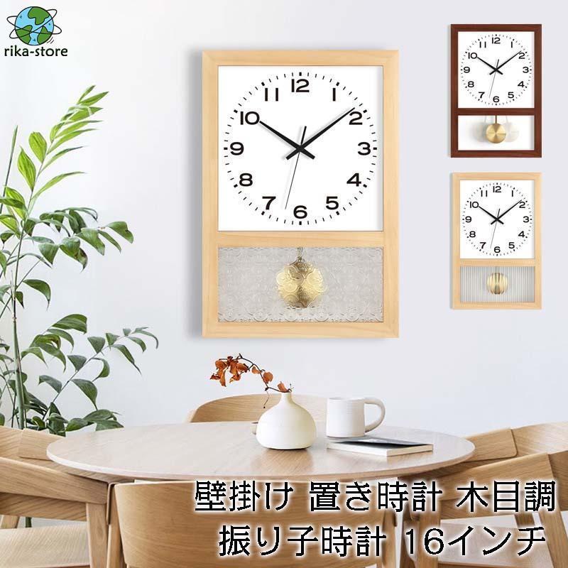 掛け時計 壁掛け 置き型 2Way 振り子時計 四角型 ウォールクロック 木目調 インテリア 時計 木製 モダン 北欧 新築祝い ギフト 電池 静音 16inch