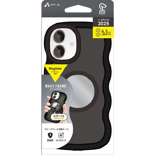 ■エアージェイ(air-j) AC-P25-WA-BK ブラック iPhone 17用 MagSafeアクセサリー対応 ミラー & スタンド付きウェーブフィット背面ケース