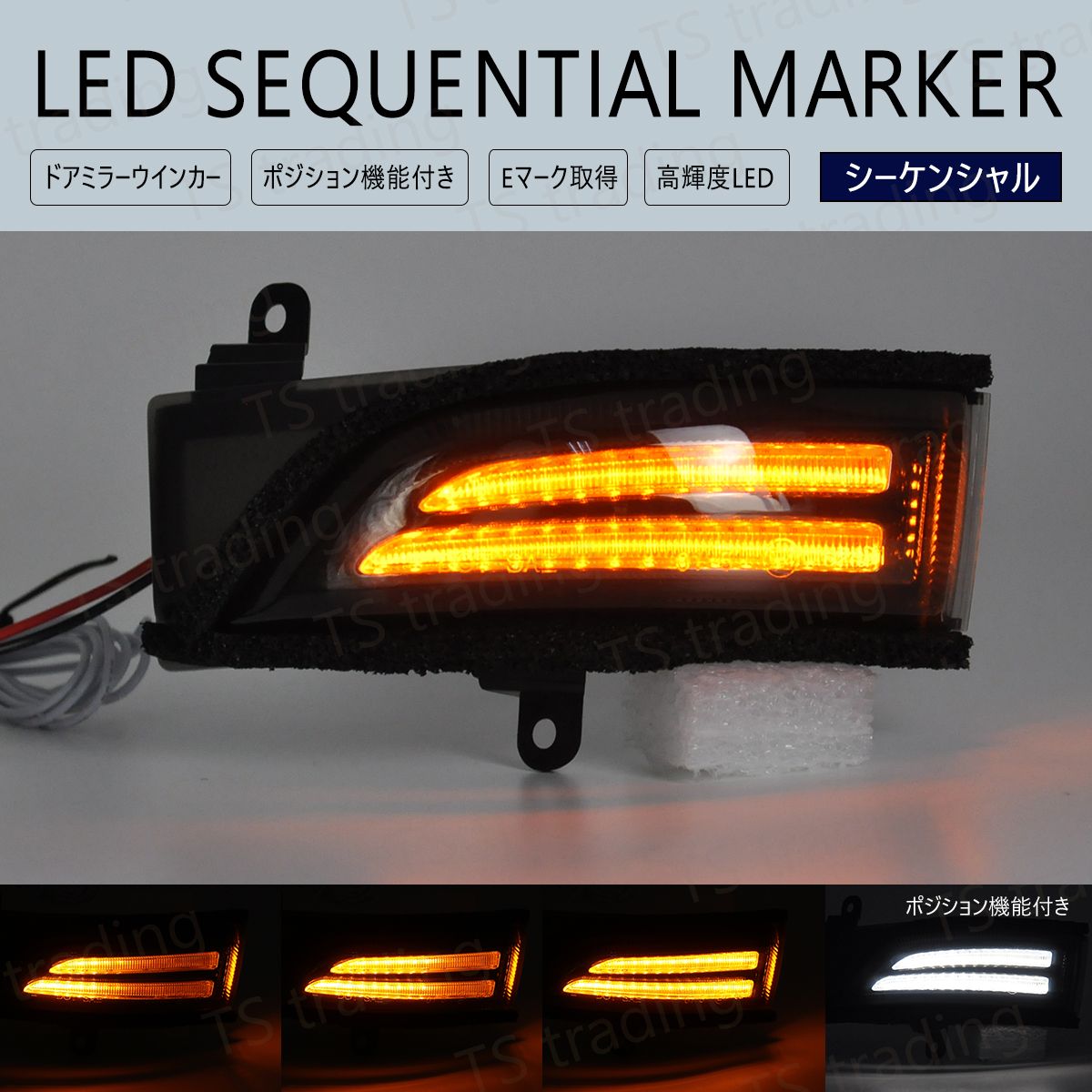 □純正ドアミラーウインカーを手軽にシーケンシャル化 ユニット本体を交換するだけの簡単取り付け。 白色配線をイルミ連動にするとポジション時に白色で発光します。 □Eマーク取得 国際規格のEマークを取得した製品です。 ※車検の可否は検査官の判断次第となります。 □取り付け ネット上にも交換方法が動画などで出回っておりますので是非検索して参考にしてください。