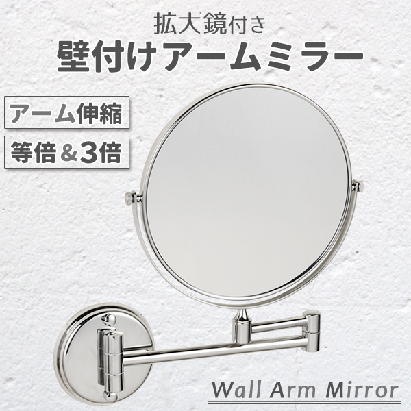 ホテル仕様の拡大鏡付き壁付けアームミラー■毛穴までくっきり!メイクの時にも♪片面等倍、もう片面は3倍の拡大鏡。今まで見えなかった毛穴までくっきり見えます!メイクの時にも重宝する便利な機能!■アーム伸縮式で見やすい位置に自由自在♪見やすい位置までぐーーんと伸びるアーム式。自分が鏡に近づかないとよく見えない、鏡に顔をよせた際、ムリな姿勢になり腰を痛めた、などということからも解消されます。海外のホテルで採用されている鏡と同じ仕様で耐久性が高く、アームなどの可動部のガタツキ・ぐらつきなどの心配がありません。■好みの角度にピタッと止まるミラー部分は、上下に360度、左右に360度回転するので、お好みの角度に調整可能です。鏡を左右から支えている可動部は適度な硬さで、鏡面が自重で下を向いてしまうことがなく、お好みの角度に片手でピタっと止めることができます。【商品詳細】材質:ステンレス鋼カラー:シルバーサイズ(約):画像参照倍率:3倍鏡重量(約):0.8kg【注意事項を予めご了承ください】